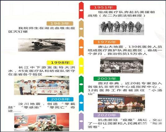 ——護佑人民生命健康。社會養育了醫學院,醫學院反哺著社會。附屬協和醫院、同濟醫院是集醫療、教學、科研、培訓為一體的大型現代化綜合性醫院,是中部地區醫療中心、區域終極診療醫院,綜合實力位居國內前十;附屬梨園醫院突出老年病學的特色,是湖北省老年病防治研究中心;2016年以來,醫學院組織實施了附屬醫院擴增計劃,按省校、市校共建共管模式,將7所有實力的專科醫院和有特色的綜合醫院擴增為非直屬附屬醫院。10所附屬醫院組成的“同濟臨床醫療集團”始終堅持生命至上的原則,堅持以愛心奉獻社會,以仁術服務人民,認真履行醫療服務職責,積極參與公共衛生事件、援外援疆、應急救災、對口幫扶工作,暖醫、匠醫、仁醫不斷涌現,譜寫出一曲曲救死扶傷的壯美華章。1951年,選派醫療隊赴抗美援朝戰場參與志愿軍戰地醫療服務;1954年,組成1000余人搶險突擊隊和醫療服務隊參加武漢防汛救災;1976年,組建130名醫務人員醫療救護隊奔赴唐山大地震區,救治傷員15萬余人;1998年,選派45支醫療隊和防疫隊堅守在長江中下游特大洪水各個險區;2003年,派遣近20名專家加入各級抗擊非典研究中心或指揮中心,選派12名醫務工作者赴“小湯山”參與臨床救治工作;2008年,選派醫療隊赴汶川地震區,創造“零截肢”“零感染”“零死亡”奇跡;2020年以來,面對新冠肺炎大疫,醫學院迅速發揮綜合學科優勢,針對新冠病毒的流行病學、快速診斷檢測與試劑、藥物疫苗研發、臨床診治規范、疾病防控機制、公共衛生治理、病人心理干預等重大科學問題,組織專家開展應急科研攻關,積極為政府建言獻策;十所附屬醫院盡銳出戰,全國投入最大、貢獻最大,3.4萬名白衣戰士挺身而出,不懼生死、不計報酬,始終堅守臨床一線,為疫情防控與患者診治提供“同濟方案”,貢獻“同濟智慧”,又一次交出了一份讓國家和人民滿意的“同濟答卷”。