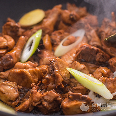 3、鍋中放油燒熱,煸香蔥段、姜塊、八角、香葉,然后將雞放入煸炒至變色,加入料酒、醬油翻炒均勻。