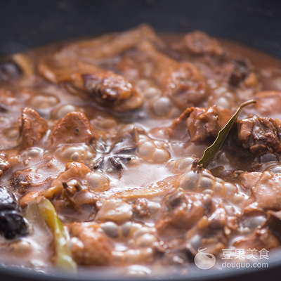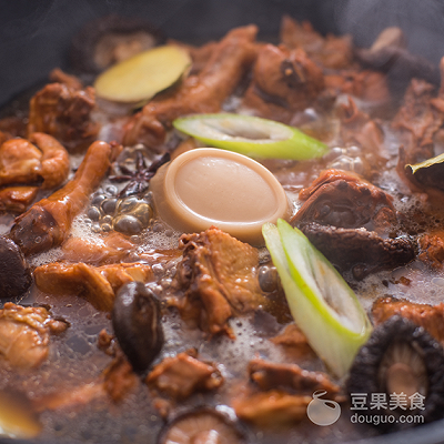 5、家樂濃湯寶炆燉專用溶成濃醇高湯,滲入食材,大火燒開后轉小火燉至湯汁收濃,最后撒白胡椒粉提香即可。