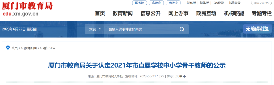 《廈門市教育局關于認定2021年市直屬學校中小學骨干教師的公示》