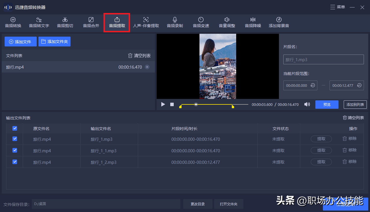 通常我們會用到【迅捷音頻轉換器】,上面有個“音頻提取”功能,將保存的視頻添加進去,就能自動分離出音頻了。