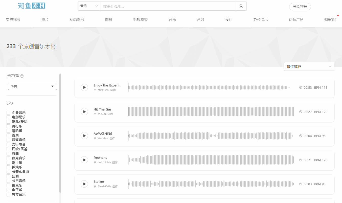 這個資源網站比較全面,圖片、視頻、音樂、音效等素材,都可以免版權使用。目前有233個音樂素材和663個音效素材,支持試聽,你可以按照類型、情緒進行篩選。