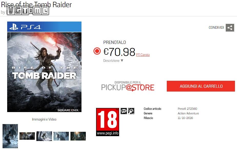 根據大型游戲零售商Gamestop的意大利分站所泄露的信息,《古墓麗影 崛起》的PS4版將于今年10月11日發售。