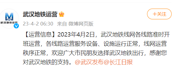 2023年4月2日,武漢地鐵線網各線路準時開班運營,各線路運營服務設備、設施運行正常,線網運營秩序正常。
