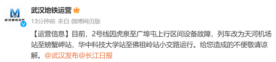 4月1日晚,武漢地鐵發布消息稱,2號線因虎泉至廣埠屯上行區間設備故障,列車改為天河機場站至螃蟹岬站,華中科技大學站至佛祖嶺站小交路運行。