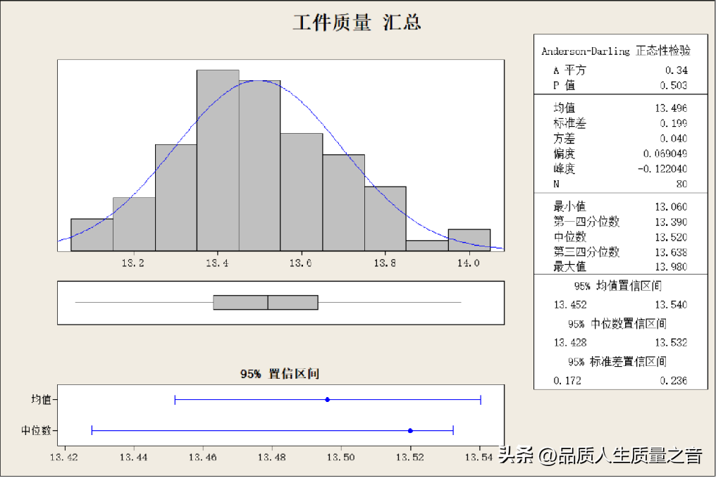 直方圖大家都很熟悉了,它可以描繪質量分布狀況,反應質量分散程度,得出數據是否服從正態分布,上圖里的P=0.503>0.05,服從正態分布。