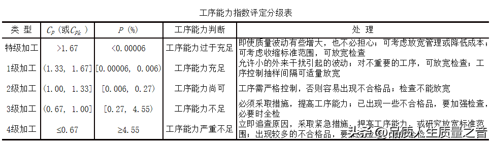 工序能力是指工序處于控制狀態下的實際加工能力,工序能力指數客觀定量地反映了工序能力滿足技術要求的程度,因此可以根據工序能力指數的大小及其評定分級表,分析穩定的過程能力滿足技術要求的程度,并對過程質量進行評價。