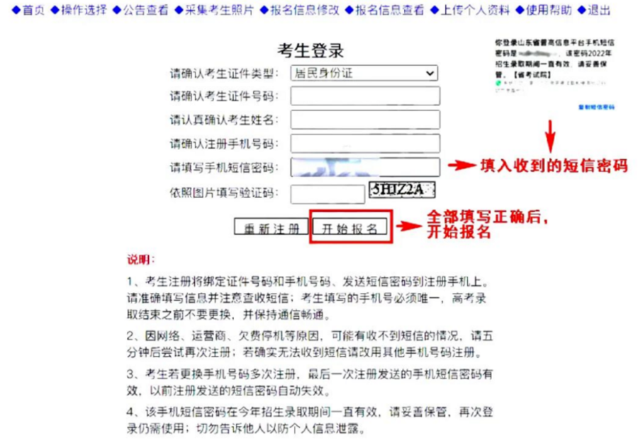 依照系統提示,考生確認個人證件號碼、手機號碼正確后,將收到的手機短信密碼填寫,點擊“開始報名”、系統進行驗證手機短信密碼,無誤后才可以繼續操作。