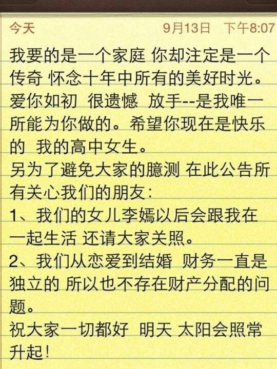 離婚聲明也有些茶里茶氣:“我要的是一個家庭,你卻注定是一個傳奇。”