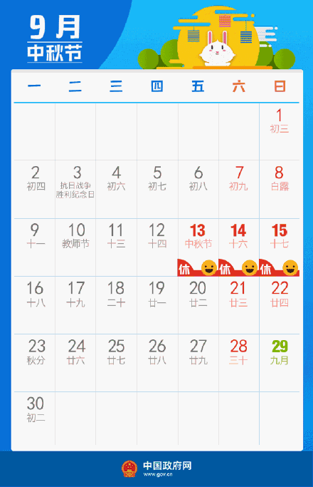 2019國家法定假期只剩兩個【放假通知!2019年國家法定節假日只剩兩個了!】自從端午節假期以來,幾乎天天是熱浪相伴。8月快過去了,你們還記得這兩個月都是怎么熬過來的嗎?9月份快來了,你們想要的放假通知也來啦!根據《國務院辦公廳關于2019年部分節假日安排的通知》,2019年中秋節9月13日放假,與周末連休。根據《國務院辦公廳關于2019年部分節假日安排的通知》,下半年除了中秋節外,法定節假日還有國慶節,10月1日至7日放假調休,共7天。9月29日(星期日)、10月12日(星期六)上班。