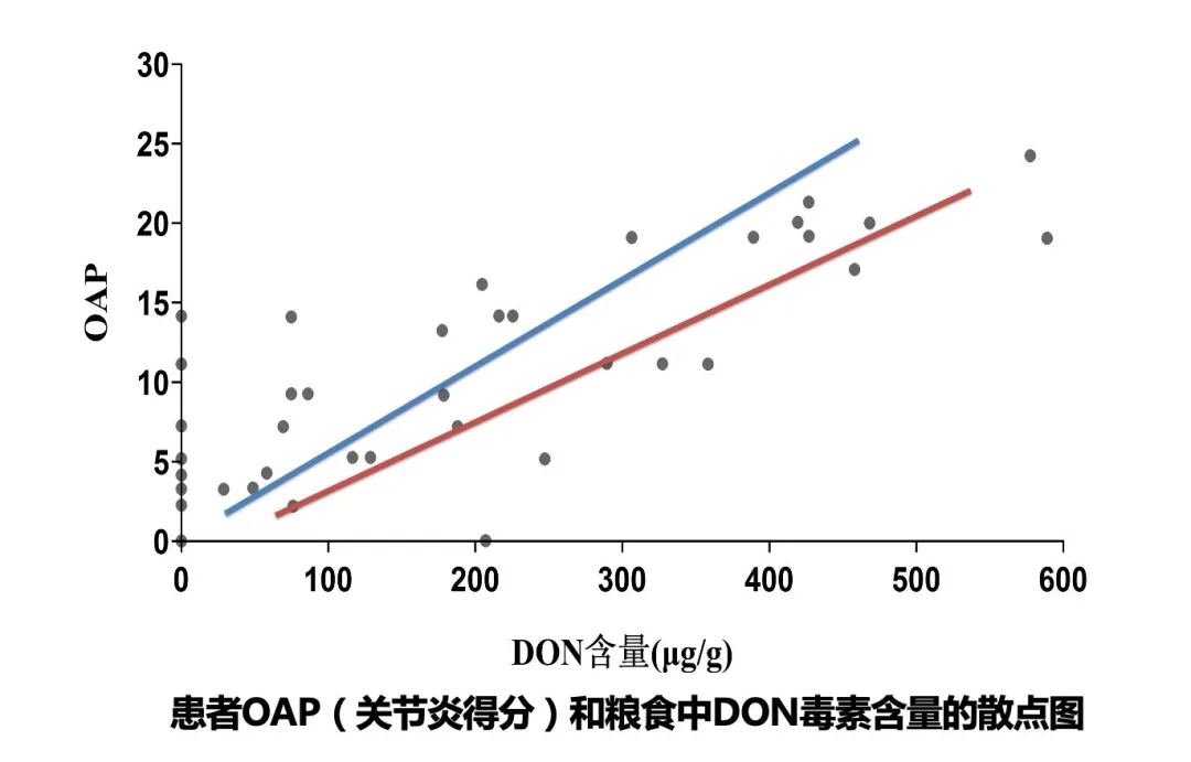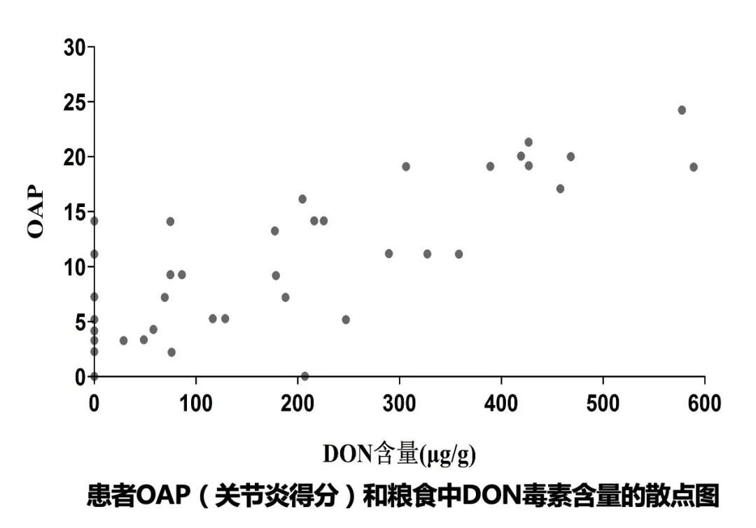 如上圖,兩變量之間正向的線性關系還是很明顯的,隨著DON的提升,OAP也有上升的趨勢,所以推測,糧食中DON毒素可能會導致患者關節炎的發生。
