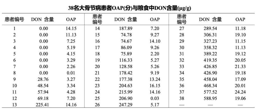 借用我們講相關分析時的例子:探討糧食中某種毒素(DON)對骨關節炎評分(OAP)的影響,數據如下:
