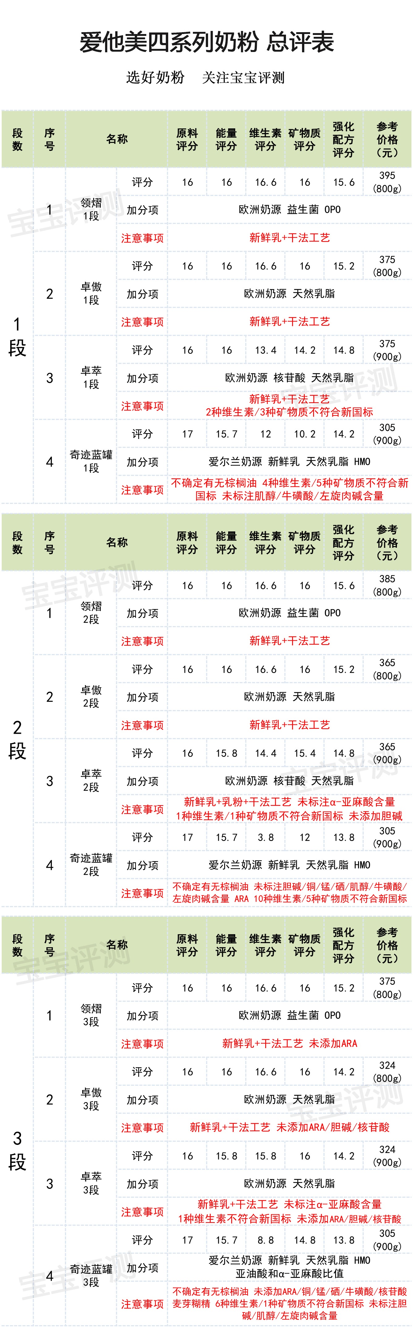 根據以上分析,笨爸爸綜合了奶源地、奶基原料、基礎營養、強化配方等指標,對愛他美卓萃、卓傲、領熠、奇跡藍罐進行了一個大體的總結,如下圖: