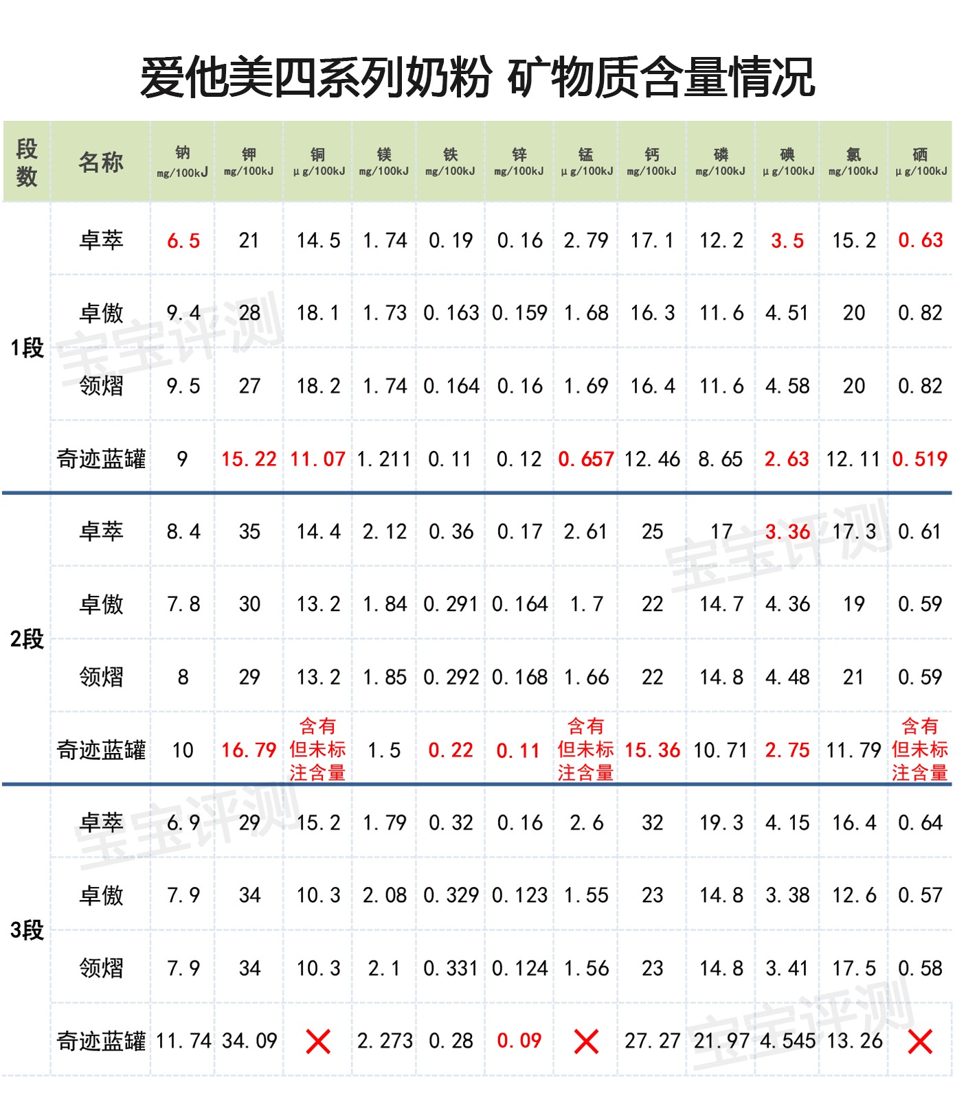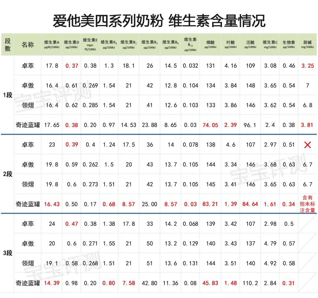 卓萃、奇跡藍罐各段均存在不符合新國標的情況(標紅),特別是奇跡藍罐,較多維生素和礦物質的含量低于中國奶粉新國標要求。