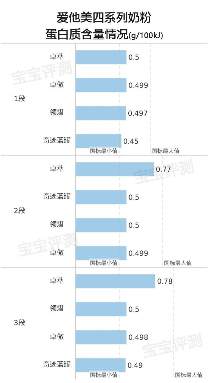 1、卓萃、卓傲、領熠、奇跡藍罐,各段的蛋白質含量均符合中國奶粉新國標要求。