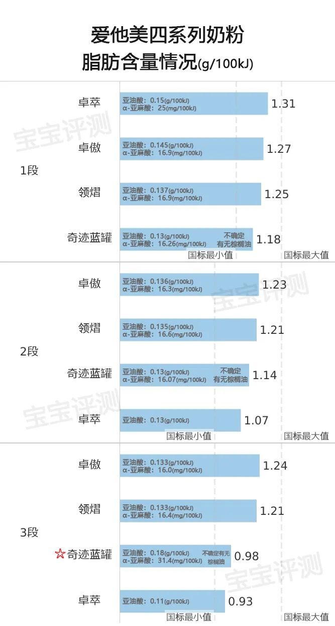 奇跡藍罐同樣符合該項要求,而且其3段的亞油酸與α-亞麻酸比值介于5:1-6:1(標注為☆),是世界衛生組織建議的最佳比例。