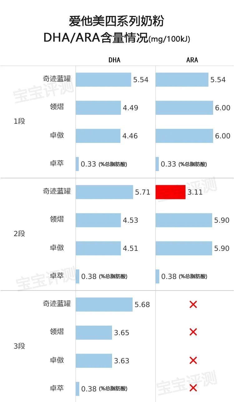 3、卓萃、卓傲、領熠、奇跡藍罐,3段均未添加ARA。奇跡藍罐2段的ARA含量低于DHA含量,不符合中國奶粉新國標要求。