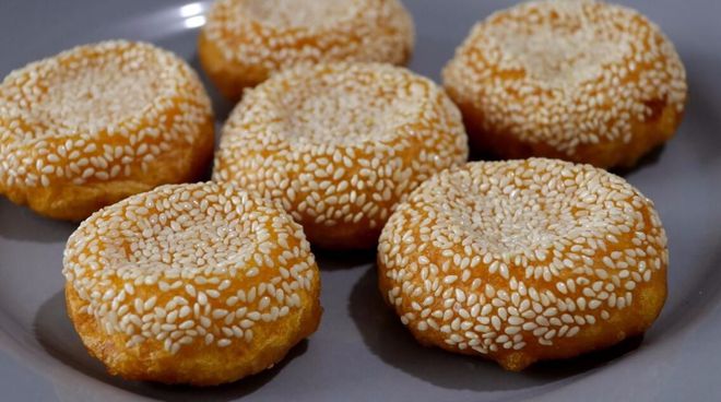 6、 準備一個空碗,倒入芝麻,把搓好的圓子先用掌心輕輕按扁后,放入芝麻中滾一滾,讓表面充分包裹著芝麻就可以了。