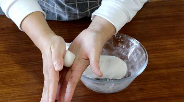 2、 糯米團搓成長條,用刀分成一小塊一小塊的,取出一塊小劑子,先搓圓,再用手心按壓成一個圓形。