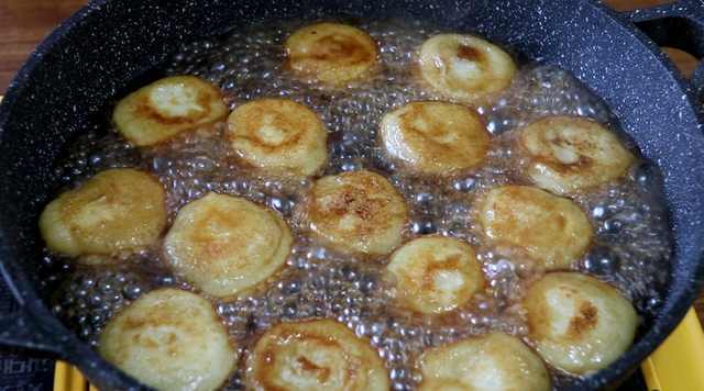 7、 鍋中倒入適量的油,油燒到一定的熱度后放入南瓜餅炸,兩面都炸黃就可以撈出控油了。