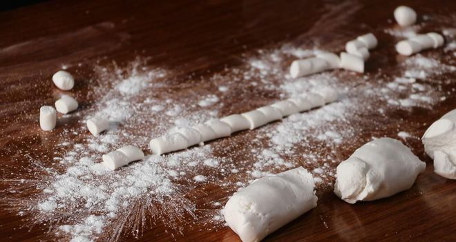 6、 時間到了以后,用刀把成型的餅狀切成長條狀,再用手把長條卷起來就完成了。