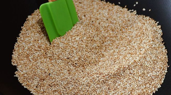 1、 鍋加熱,倒入芝麻,開小火把芝麻炒熟,用鏟子不停的翻動直到表面變黃就可以盛出放入盤子里。