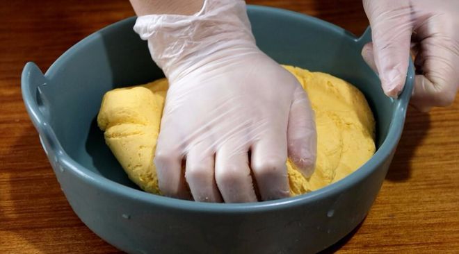 4、 剩下的南瓜泥中加入糯米粉一起攪拌,用手揉成團狀。