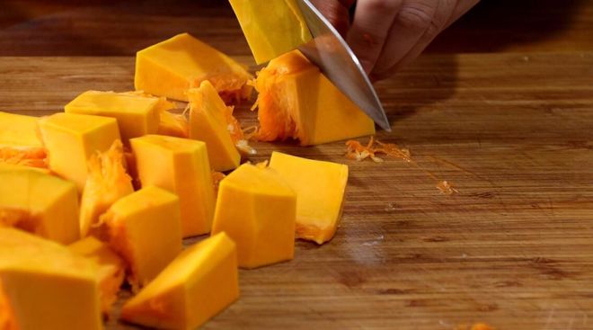 1、 南瓜清洗干凈,削去外皮,把南瓜瓤處理干凈后切成塊。
