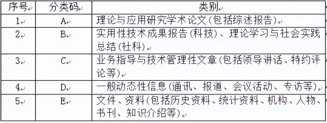 文獻標識碼是按照《中國學術期刊(光盤版)檢索與評價數據規范》規定的分類碼,作用在于對文章按其內容進行歸類,以便于文獻的統計、期刊評價、確定文獻的檢索范圍,提高檢索結果的適用性等。具體分類如下: