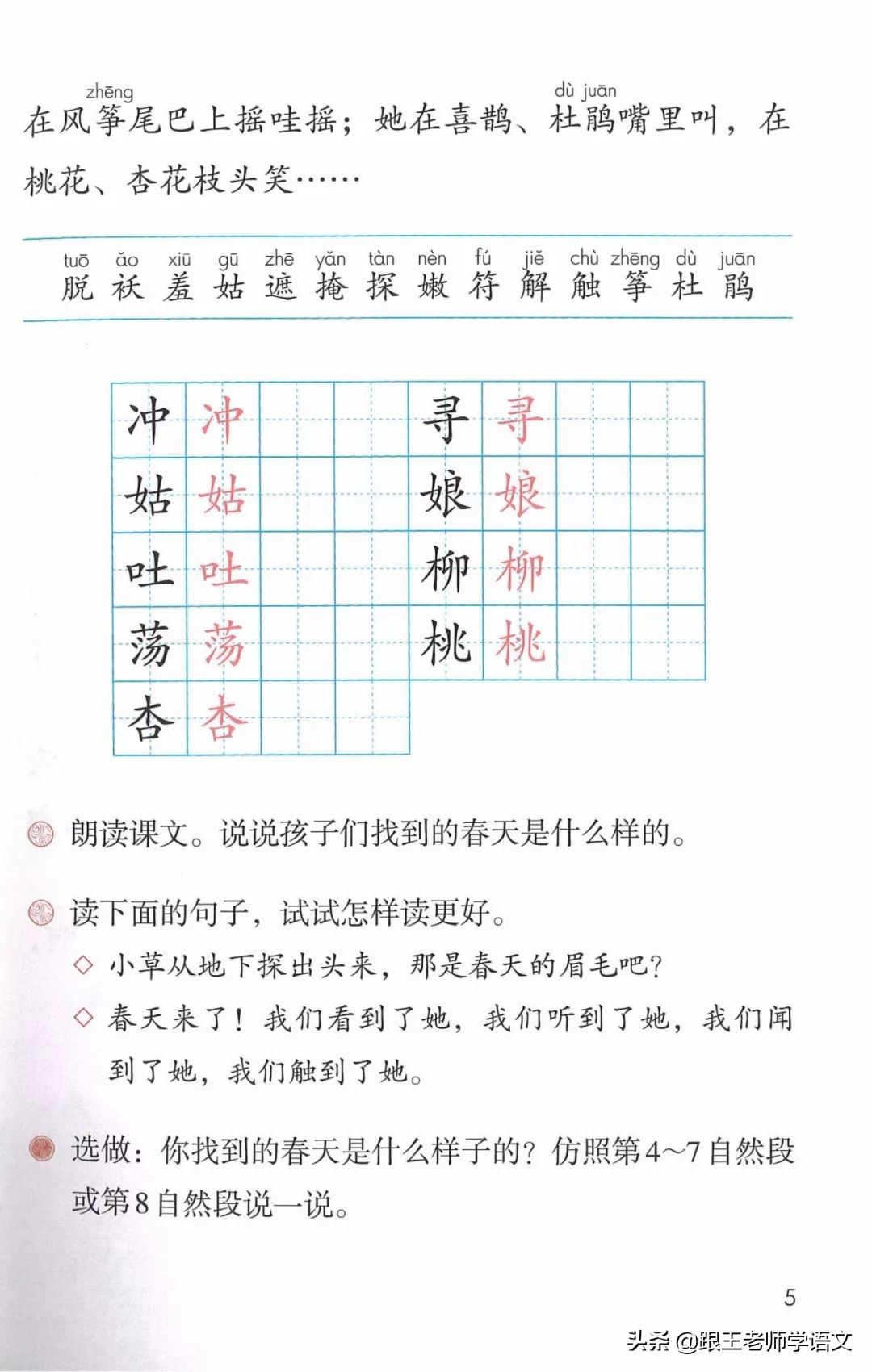 春天來了,她像個害羞的小姑娘,悄悄地向我們走來。本文的課題呼喚著我們──找春天去吧!我們到校園里找一找,也許能在操場邊發現剛探出頭的小草;我們到野外去找一找,也許能在天空中發現飄飄搖搖的風箏;打開課本,我們還會在課文插圖中發現春天的影子;讀著課文,我們會感覺到自己就是那幾個脫掉棉襖、沖出家門、奔向田野的孩子,體會到尋找春天的急切心情,感受到發現春天的欣喜。
