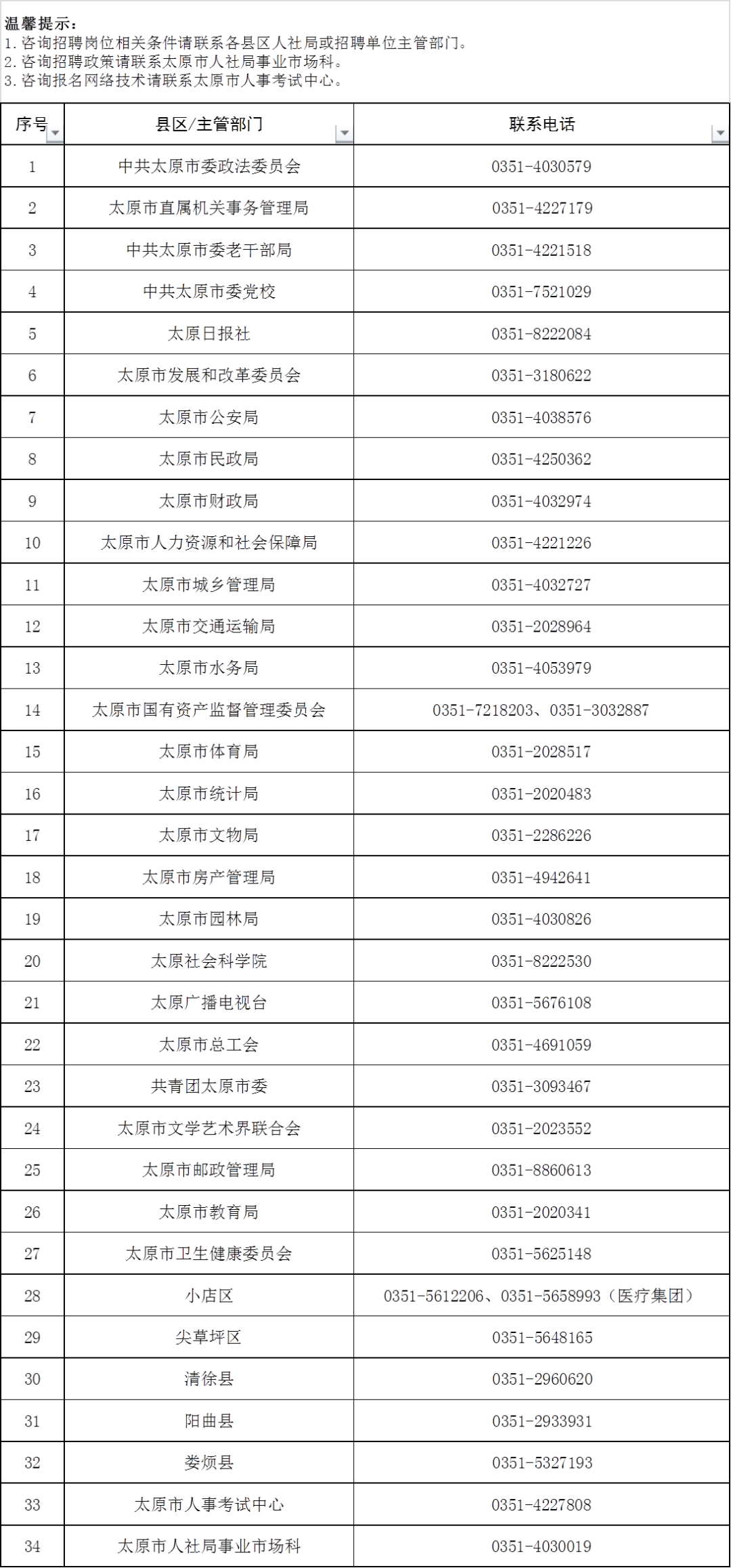 報名期間,咨詢報名資格條件等請聯系各縣區人社局、市直各部門(單位),聯系電話見《咨詢電話一欄表》(附件2);咨詢報名網絡技術問題請聯系太原市人事考試中心,聯系電話:0351-4227808。