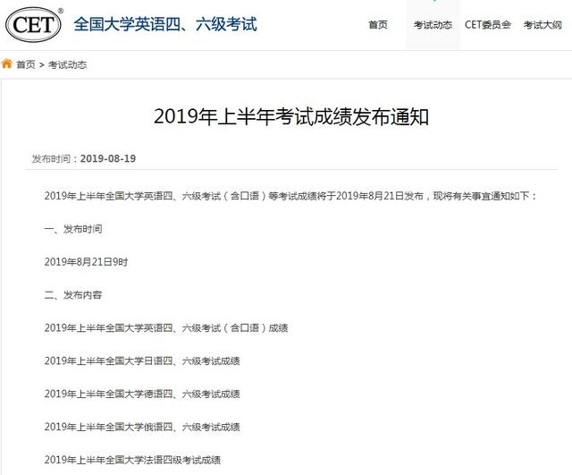 2019年上半年全國大學英語四六級考試成績查詢服務將于8月21日9:00開通。