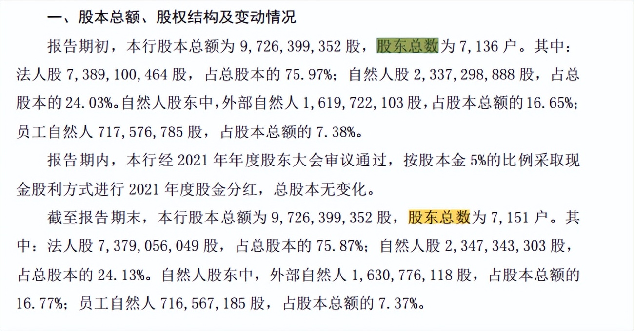 此前,聯合資信評估股份有限公司對江南農商行的評級報告指出,除第一大股東外,該行股東持股比例較低。2022年年報顯示,截至報告期末,江南農商行股本總額為97.26億股,股東總數為7151名。其中:法人股73.79億股,占總股本的75.87%;自然人股23.47億股,占總股本的24.13%。自然人股東中,外部自然人16.31億股,占股本總額的16.77%;員工自然人7.17億股,占股本總額的7.37%。