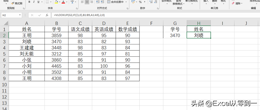 所謂的反向查找,就是我們要查找的結果在查找列的左邊,我們就稱之為反向查找,如下圖,我們想根據學號查找姓名,這個就是所謂的反向查找,反向查找也僅僅是針對vlookup來說的,我們只需要將公式設置為 :=VLOOKUP(G2,IF({1,0},B1:B9,A1:A9),2,0),然后按ctrl+shift+回車填充公式即可