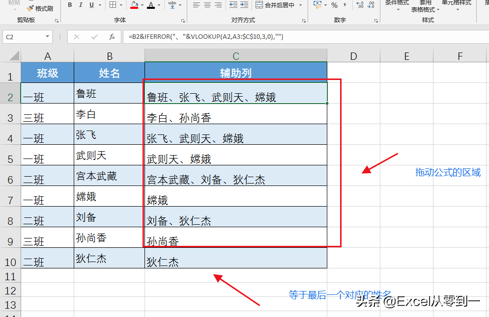 如下圖,我們想要將相同班級的姓名放在一個單元格中,首先我們班級對照表后面構建一個輔助列,在里面輸入函數:=B2&IFERROR(&34;、&34;&VLOOKUP(A2,A3:$C$10,3,0),&34;&34;)然后向下填充到倒數第二個單元格的位置也就是C9單元格,然后在最后一個單元格輸入=B10,就是最后一個單元格對應的姓名