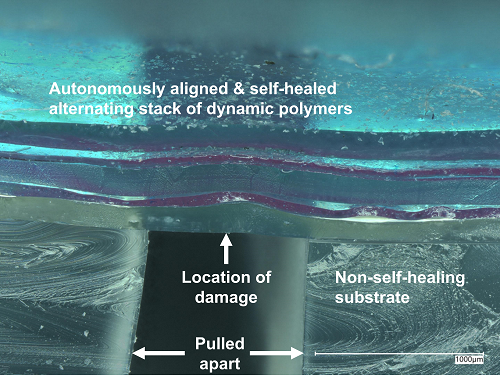 研究人員使用了聚丙二醇和聚二甲基硅氧烷,這兩種聚合物及其各自的復合材料是不混溶的,氫鍵使它們彼此很好地黏合在一起,從而創建了耐用的多層材料。