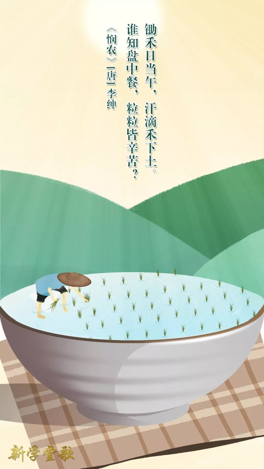 導讀憫農李紳·唐鋤禾日當午,汗滴禾下土。誰知盤中餐,粒粒皆辛苦?作品賞析此詩一開頭就描繪在烈日當空的正午,農民依然在田里勞作,那一滴滴的汗珠,灑在灼熱的土地上。這也為下面“粒粒皆辛苦”擷取了最富有典型意義