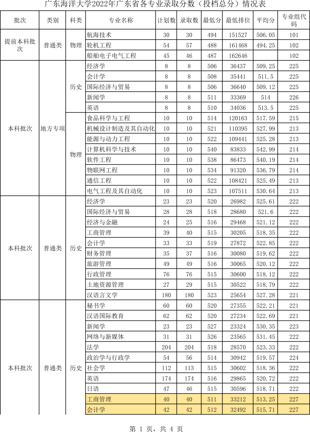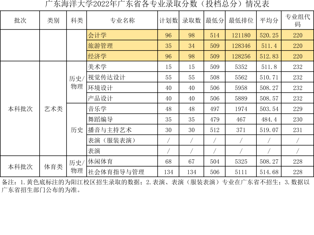 2022年我校在廣東省各專業 錄取分數(投檔總分)情況表