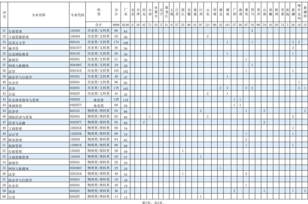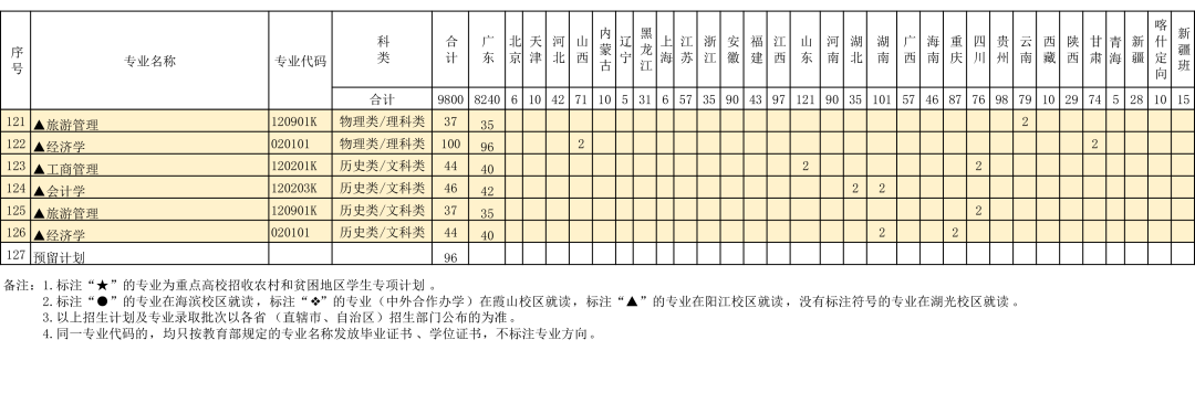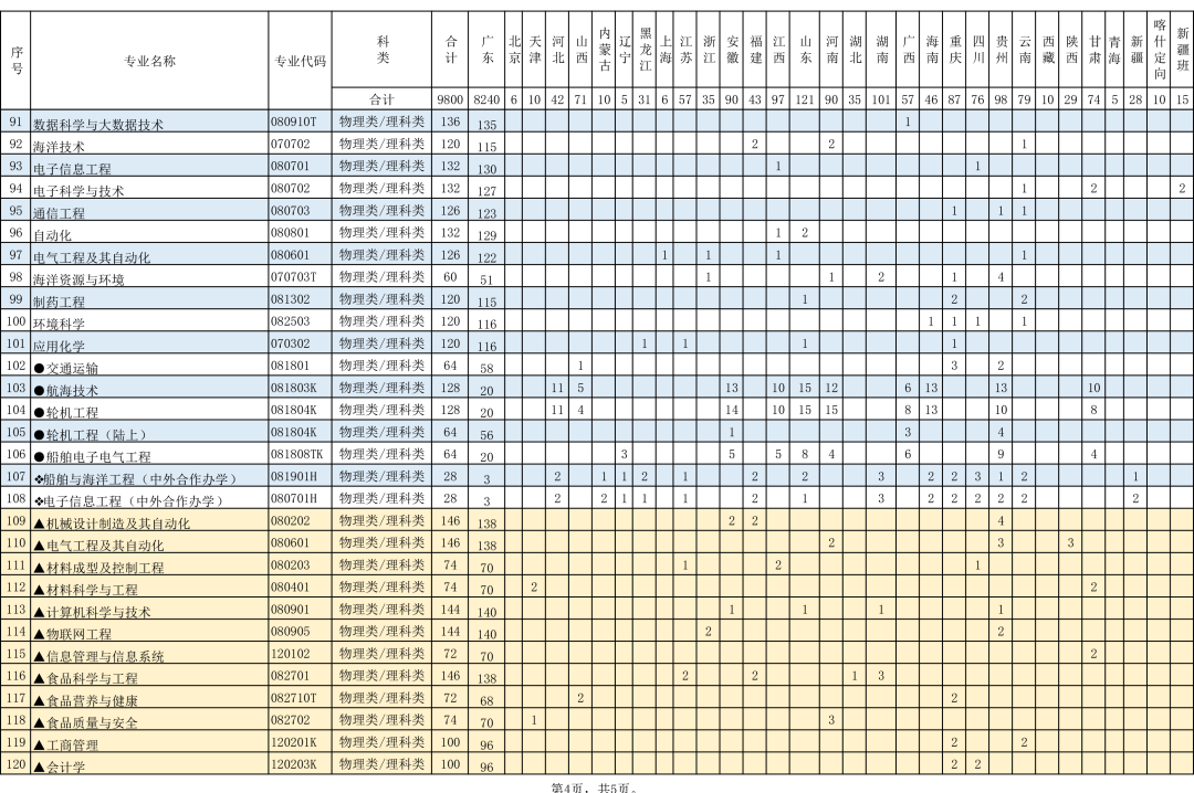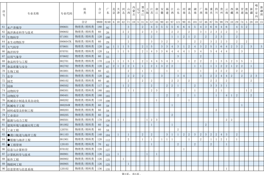 廣東海洋大學2023年普通本科招生計劃9800人,其中,廣東省招生計劃8240人(含地方專項計劃120人),廣東省外招生計劃1449人。我校今年共有湖光校區、霞山校區、海濱校區、陽江校區招收普通本科生。設本科招生專業(方向)共80個,新增廣東海洋大學圣彼得堡船舶與海洋技術學院(中外合作辦學)。學校面向廣東、北京等全國29個省(直轄市、自治區)招生。各省(直轄市、自治區)招生計劃如下(具體以各省招生部門公布的為準)