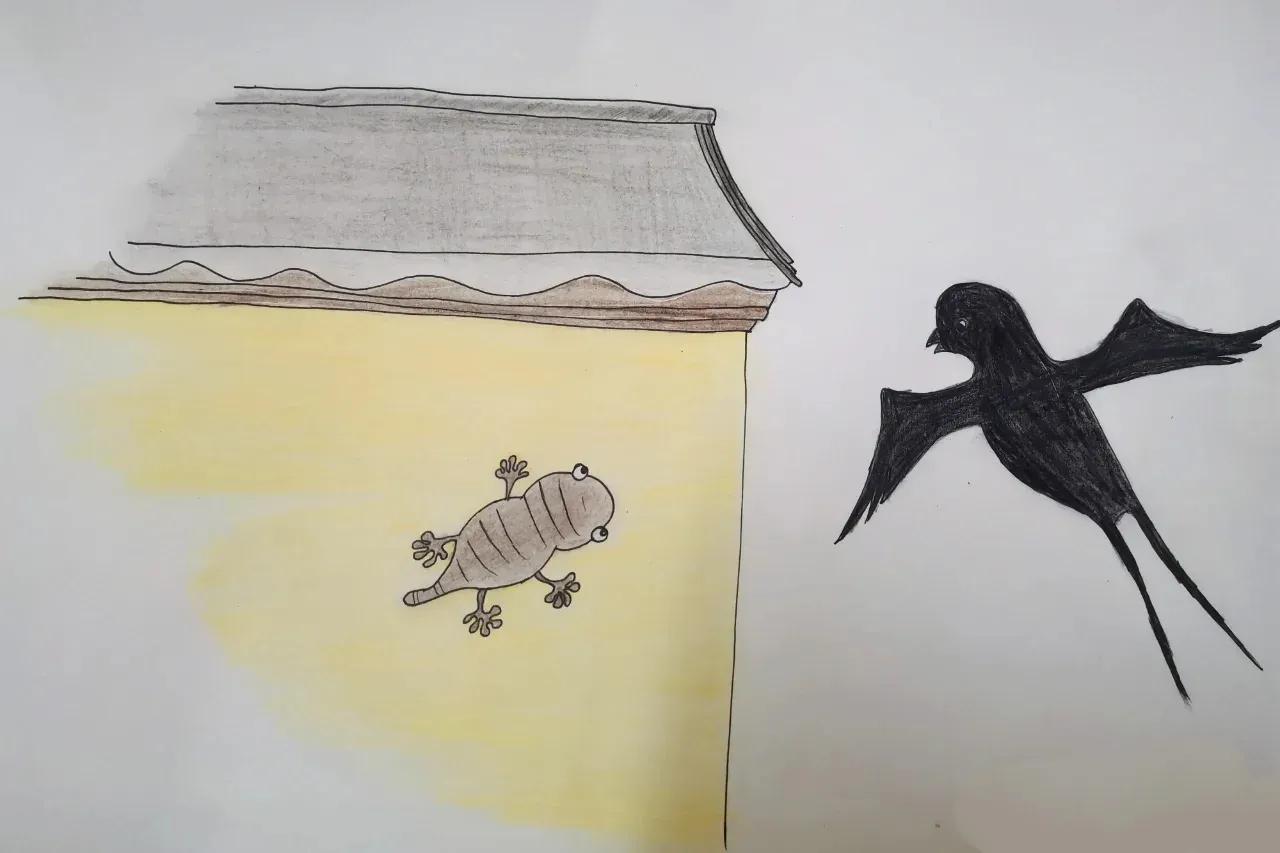 一只燕子飛了過來,小壁虎又去問燕子借尾巴,燕子說:“不行,我還要用尾巴來掌握方向呢!
