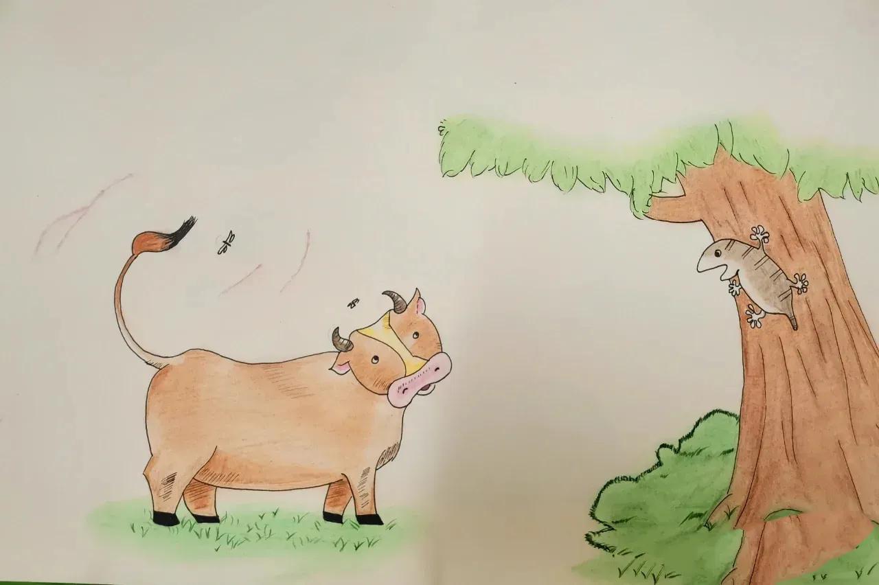 小壁虎又到了老牛,向它借尾巴,老牛說:“不行,我還要用尾巴來驅趕蚊蟲呢!”