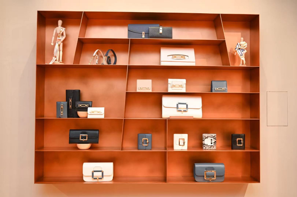 精品店內布局可謂精致巧妙,入口處的第一個空間用于展示大小皮具,匠心地選用了水磨石地板并嵌以大理石材質,壁柜則選用赤褐色灰泥展示架,中央陳列去則展示著精致的小皮具。店鋪內的第二個空間則用于展示鞋履及成衣系列。該空間精選木質地板配以明亮的橙色地毯,也為精品店的整體設計增添溫暖怡人的氣氛。內側的后墻設計是整個空間的亮點所在,墻上內嵌了飾有實木玻璃櫥窗的特制壁柜,櫥窗內含有設燈光照明設置。精品店的家具選以簡約質感的座椅與成衣陳列臺,陳列臺與其背后的實木玻璃櫥窗遙相呼應,引顧客駐足。