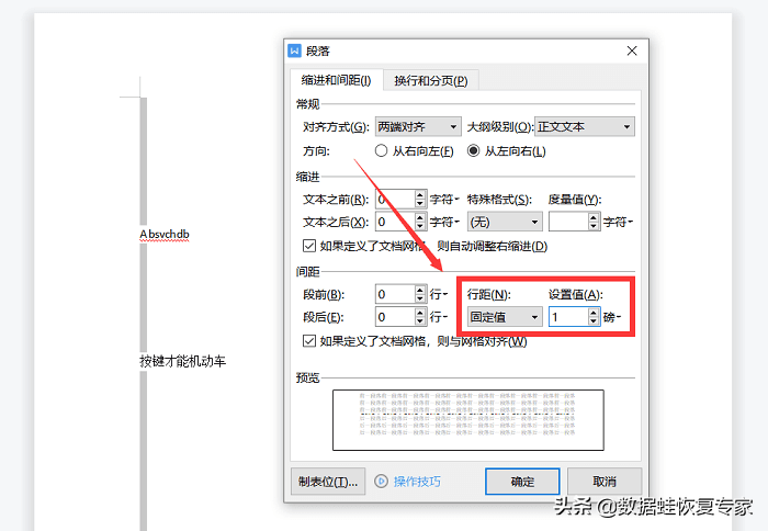 第二步:將“行距”的“固定值”調整為“1”,最后點擊“確定”。