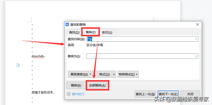 第二步:設置完“查找”項,點擊“替換”,再點擊“全部替換”。