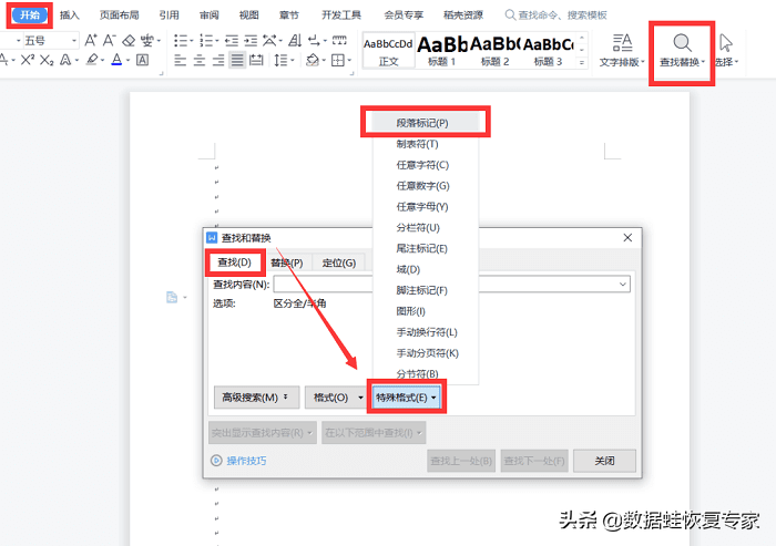 第一步:在文檔“開始”欄點擊“查找替換”,或者按“Ctrl+F”快捷鍵,點擊“特殊格式”,選擇“段落標記”。