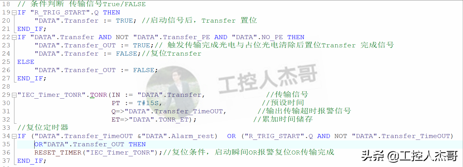 說明:當啟動脈沖觸發后,Transfer信號置位,累加定時器PT開始計時,當傳輸完成光電占位且貨物占位光電未占位,傳輸完成Transfer_OUT置位,此時復位累加定時器,若在PT計時時間內,未完成傳輸則觸發TimeOUT超時報警,此時只有Alarm_reset可以復位。