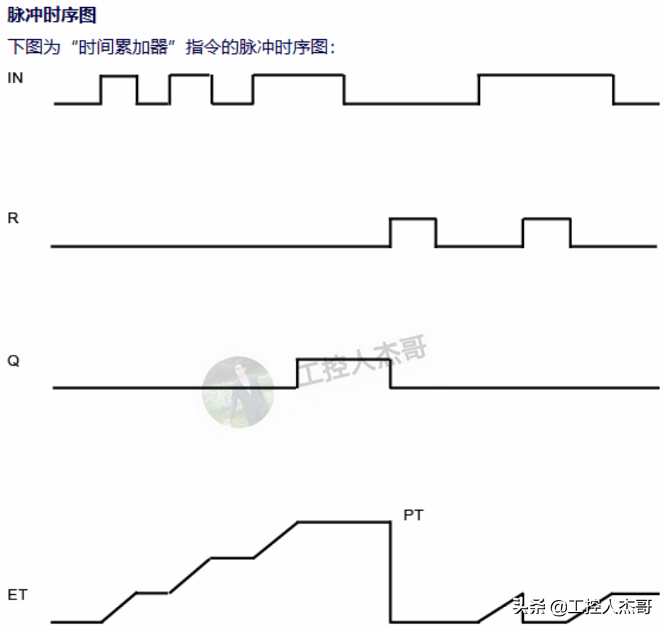 - 指令的功能含義:參數 IN 的信號狀態變為“1”時,執行該指令并且從 PT 設置的時間開始計時。時間 PT 計時過程中,如果 IN 參數信號狀態為“1”,則記錄的時間值將進行累加。累加后的時間將在參數 ET 中輸出以供查詢。達到時間 PT 時,參數 Q 的信號狀態變為“1”。即使 IN 參數的信號狀態變為“0”,Q 參數仍將保持置位為“1”。