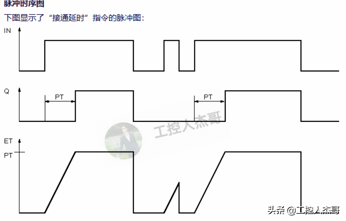 - 指令的功能含義:當參數 IN 的邏輯運算結果 (RLO) 從“0”變為“1”(信號上升沿)時,啟動該指令。指令啟動時,預設的時間 PT 即開始計時。超過持續時間 PT 時,參數 Q 的信號狀態變為“1”。只要啟動輸入仍為“1”,參數 Q 就保持置位。如果 IN 參數的信號狀態從“1”變為“0”,則復位參數 Q。當在參數 IN 上檢測到一個新的信號上升沿時,將重新啟動定時器功能。