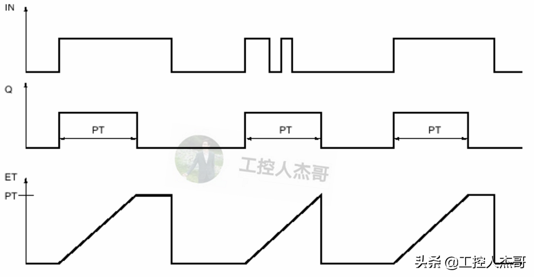 - 指令的功能含義:當參數 IN 的邏輯運算結果 (RLO) 從“0”變為“1”(信號上升沿)時,置位參數 Q。當參數 IN 的信號狀態更改回“0”時,預設的時間 PT 開始計時。只要時間 PT 正在計時,參數 Q 就保持置位狀態。超過時間 PT 時,將復位參數 Q。如果參數 IN 的信號狀態在超出時間值 PT 之前變為“1”,則將復位定時器。參數 Q 的信號狀態保持置位為“1”。