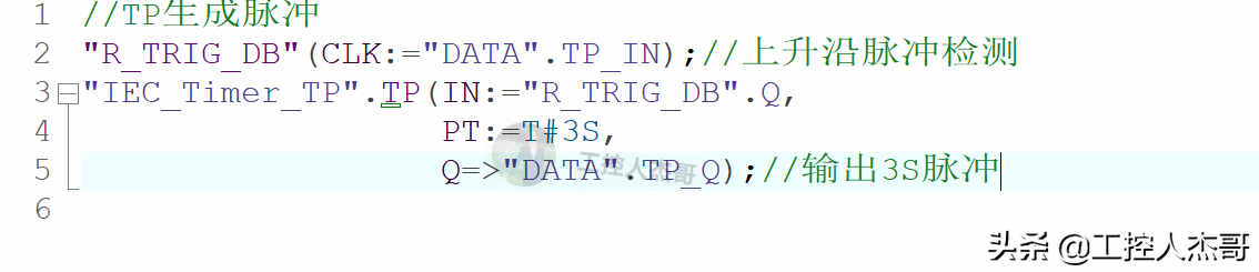 分析下:調用我們上節課學習到的上升沿指令,作為TP定時器IN接口的參數,TP預設時間3S,當DATA.TP_IN上升沿信號觸發后,R_TRIG_DB.Q輸出一個掃描周期的脈沖信號,TP定時器啟動,此時定時器輸出Q有輸出,即DATA.TP.Q為1,持續時間3S,3S后輸出為0。